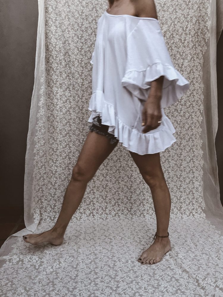 Muy cómoda y elegante el escote es bien amplio para poder jugar y caiga dejando un hombro descubierto si asi se desea.