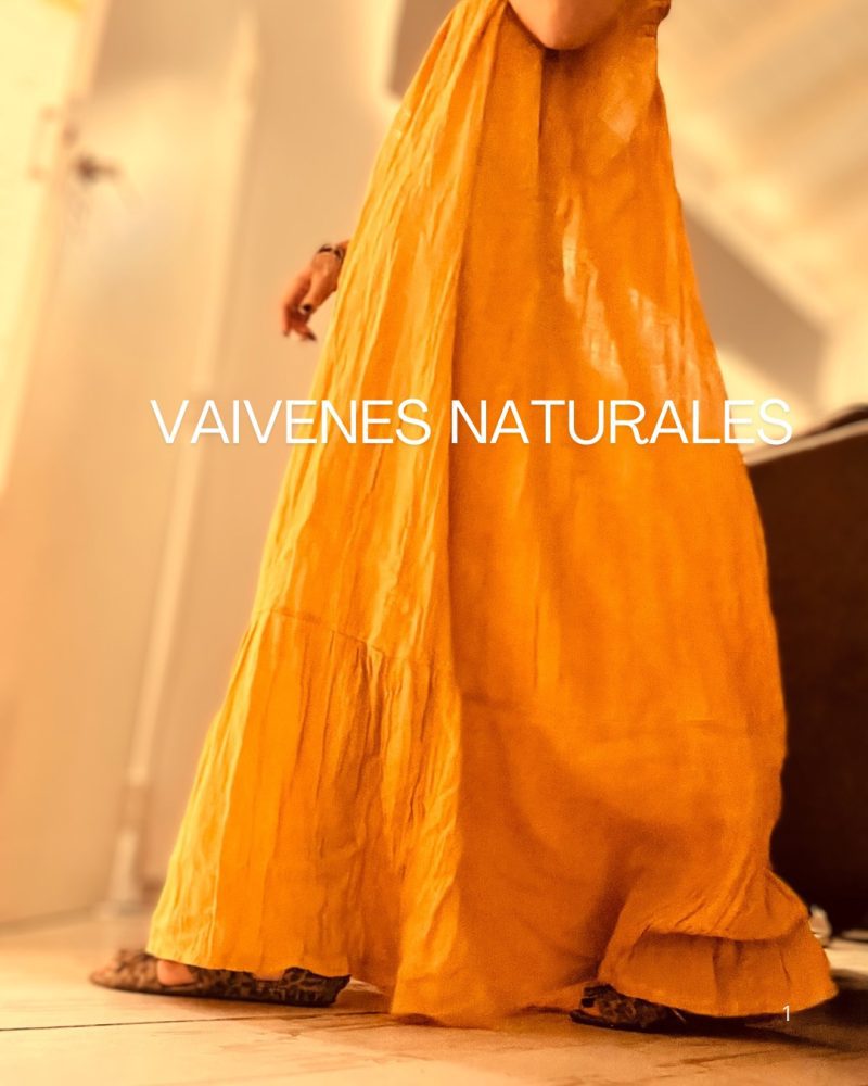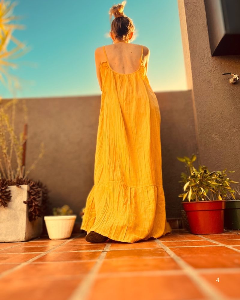 Largo, suelto y amplio escote redondo en la espalda con terminación en volado chato