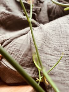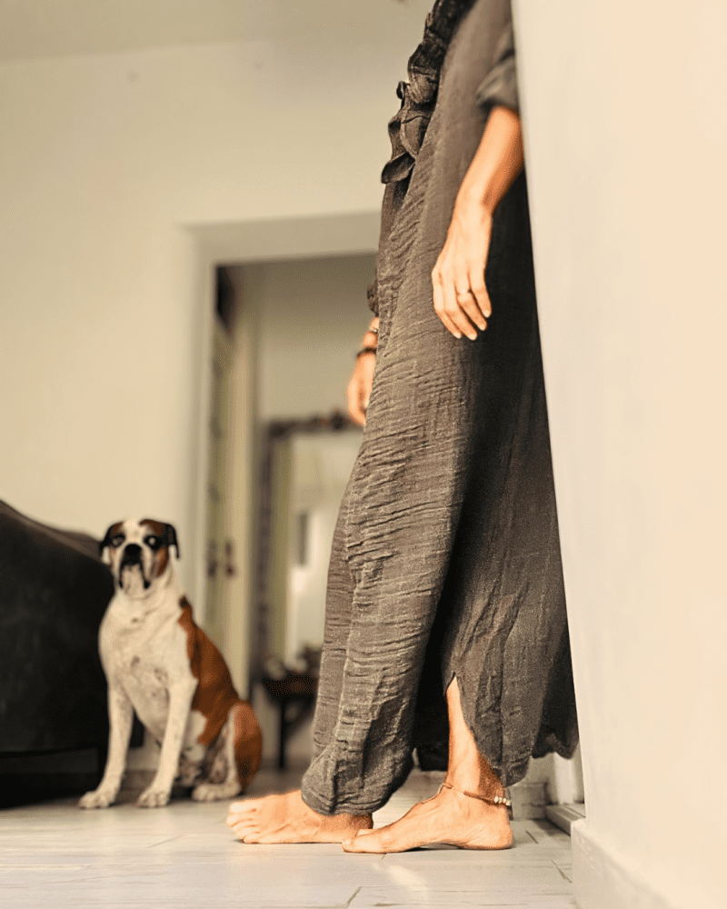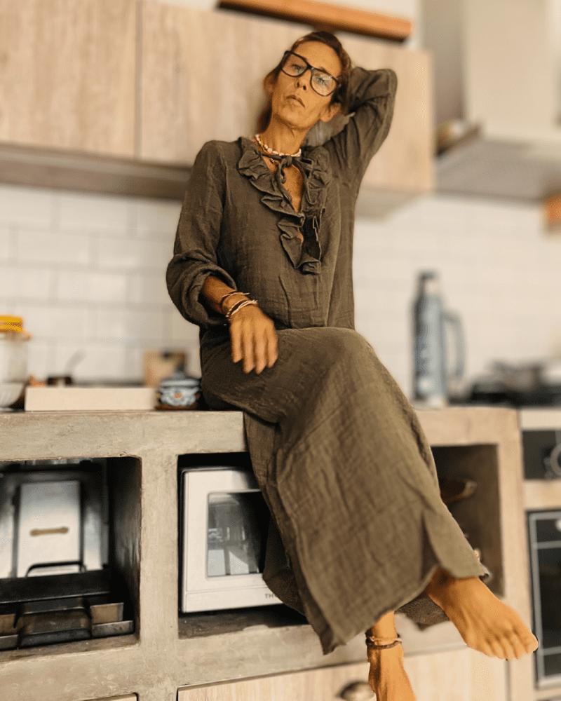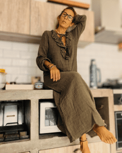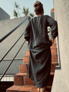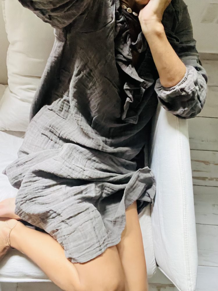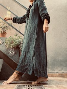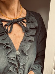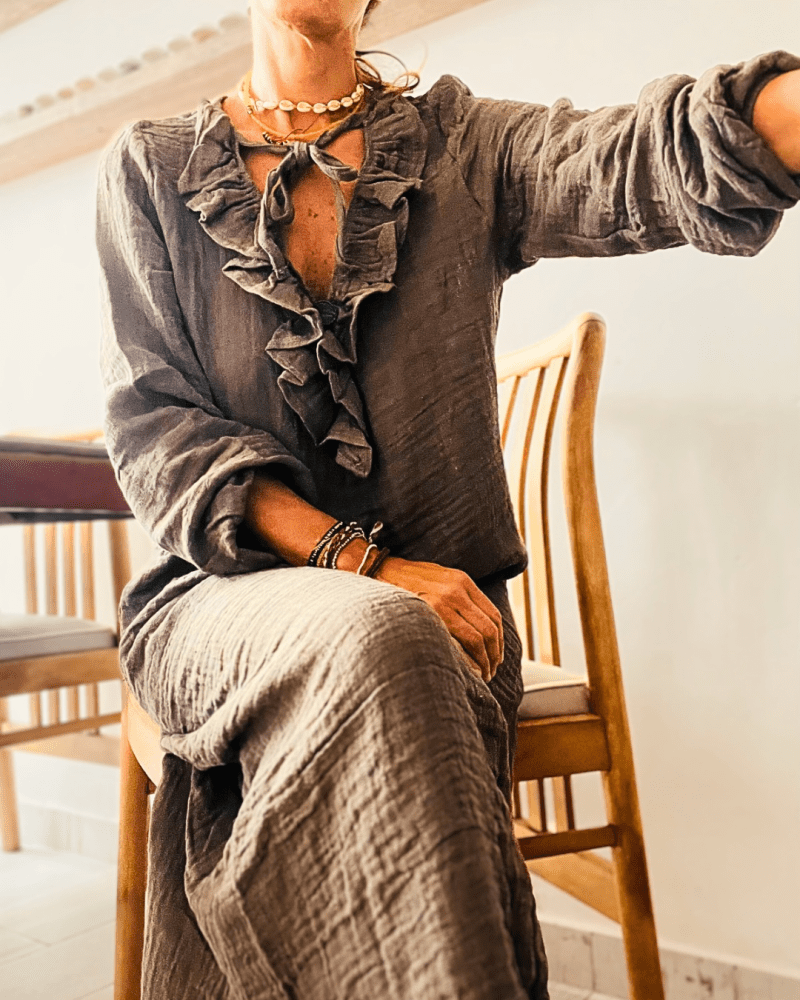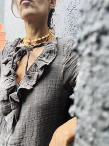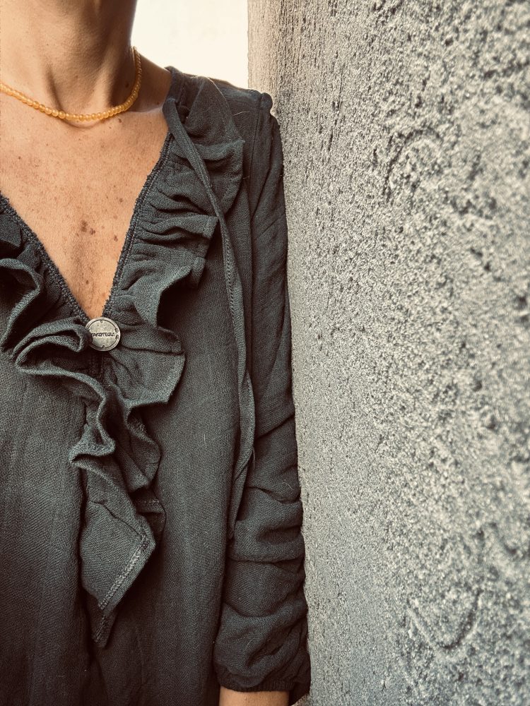 Escote en V profundo, con importante volado, que lleva dos tiritas en el cuello para anudar. Viene con un prendedor circular color hierro viejo opaco para cerrar el escote a gusto. Manga larga semi globo con elástico en los puños. Tajos laterales para que sea cómodo y libre al andar.